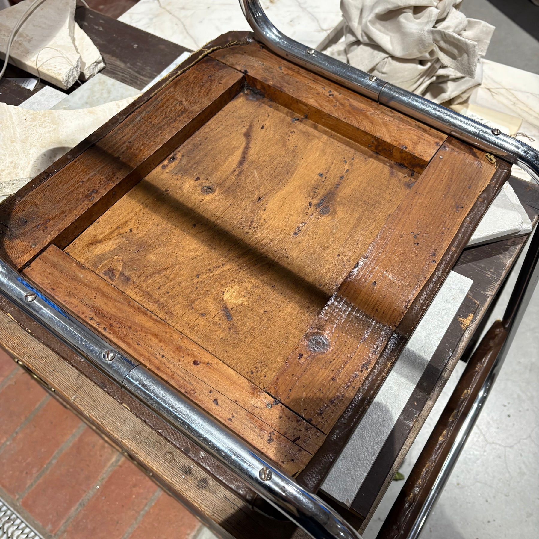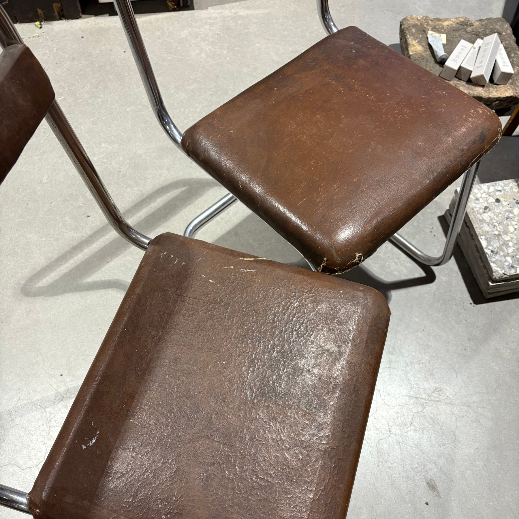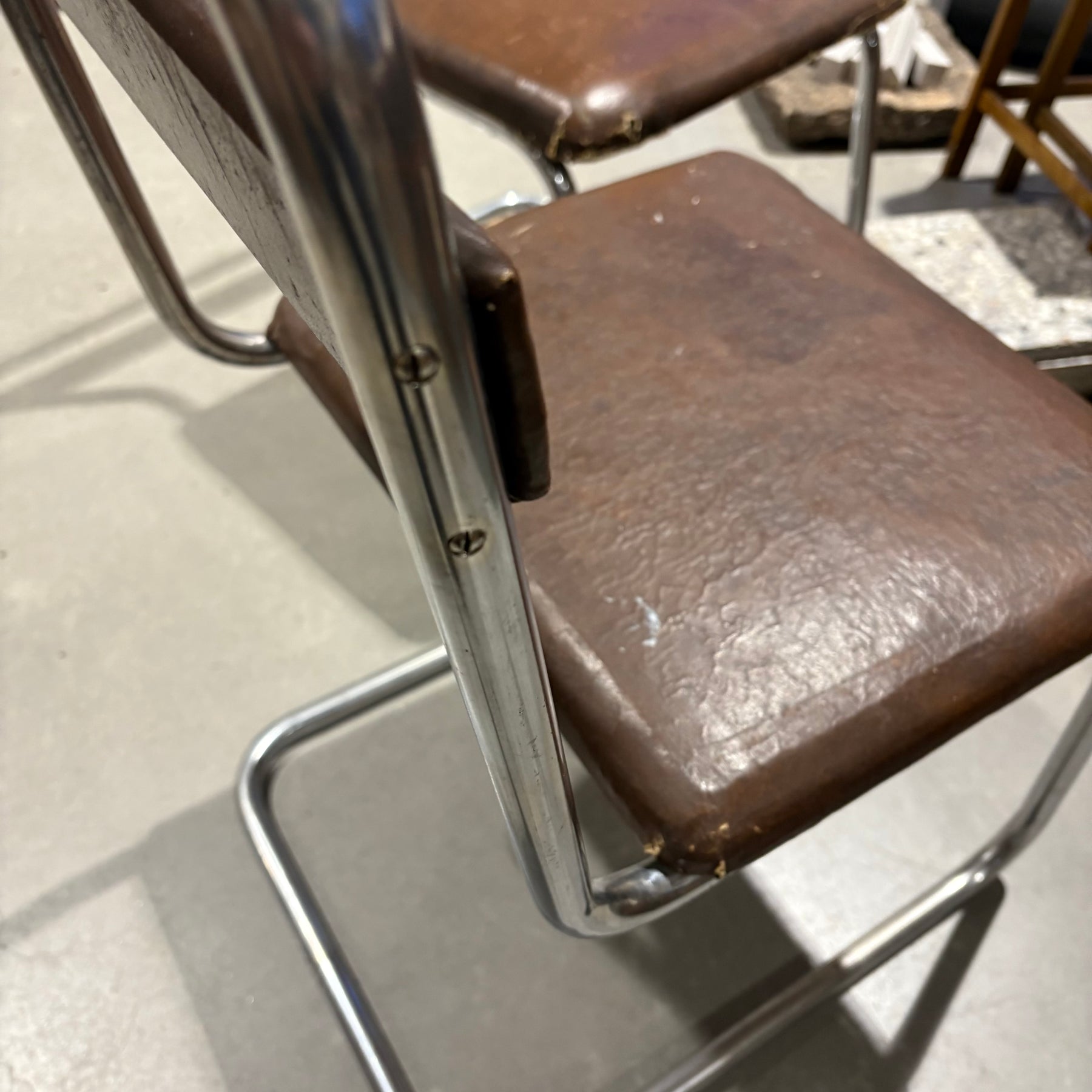 Tidiga stolar i bauhausstil från omkring 1920-talet. Tillverkade i Sverige. Stomme av stålrör och sits pegamoid (målad linneväv). I originalutförande med fantastisk patina som måste upplevas. Vi säljer två stolar som ett par.